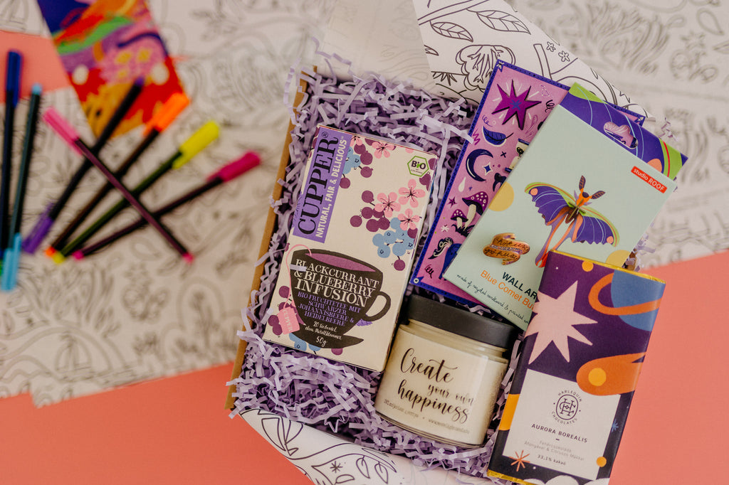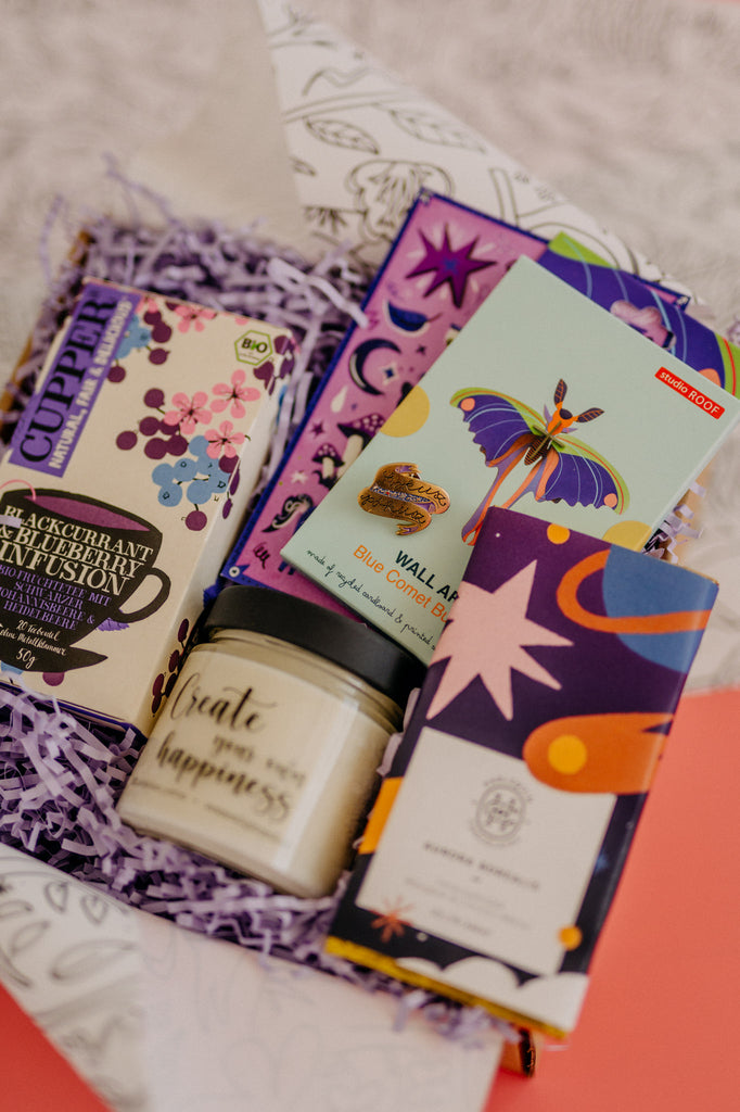 Végül egy varázslatos print, egy egyedi kitűző, egy finom téli hangulatot árasztó illatgyertya, egy korty melegség, egy isteni csoki is vár a dobozban.